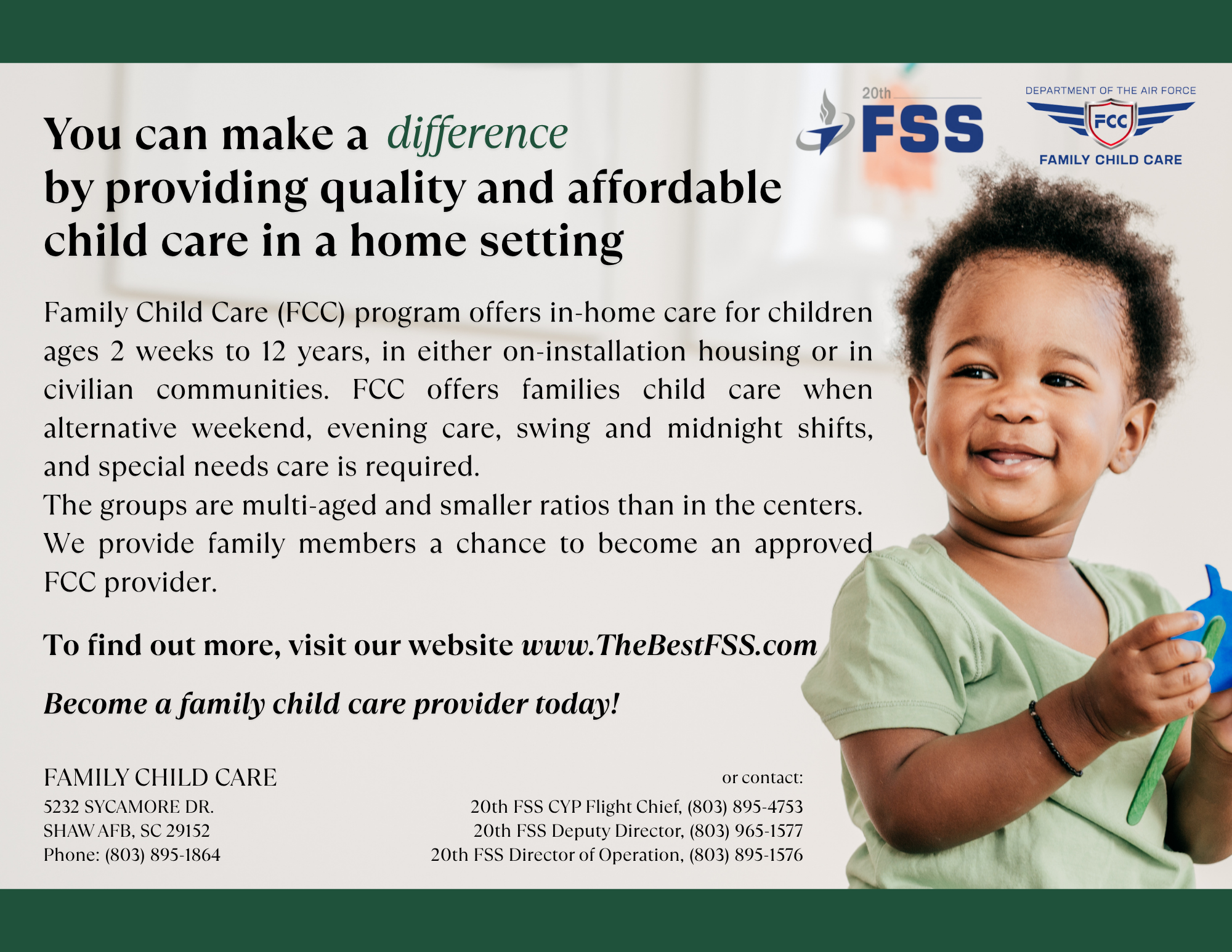 Family Child Care (FCC) is designed to provide certain military members care outside of the typical 50 hours a week alloted at the Child Development Center and Youth Programs.
