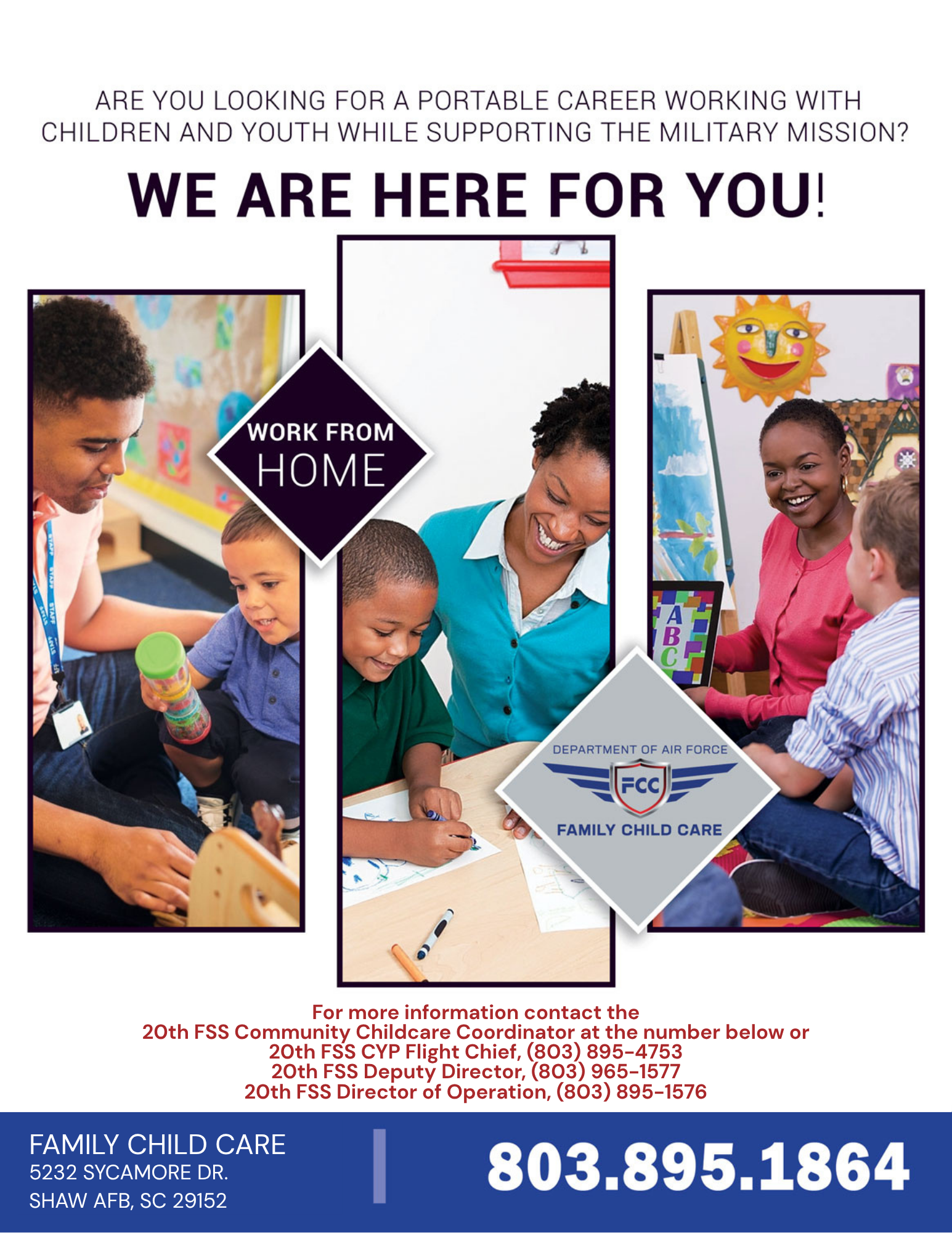 The Family Child Care office is here to serve you with your child care needs, interest in child care employment, concerns about current providers, or by offering support to our providers. Please give us a call at 895-1212 if you need FCC services.