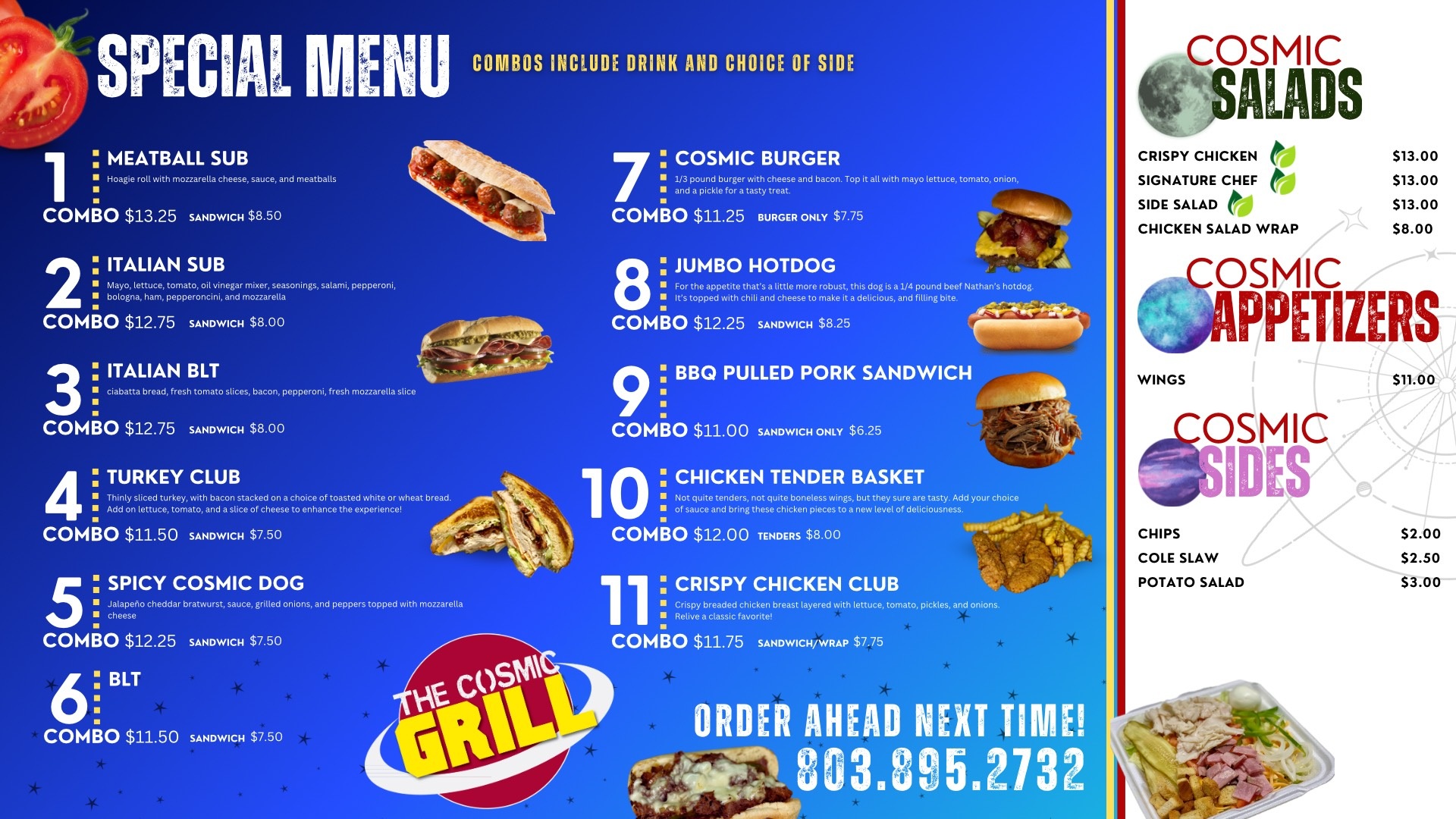 The Cosmic Grill is located at Shaw Lanes Bowling Center and offers a variety of food choices whether you are bowling or just stopping in for a bite to eat. Experience our out of this world burgers, sandwiches, and more!