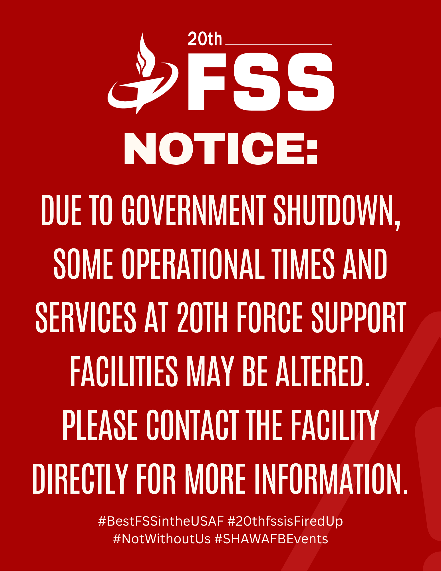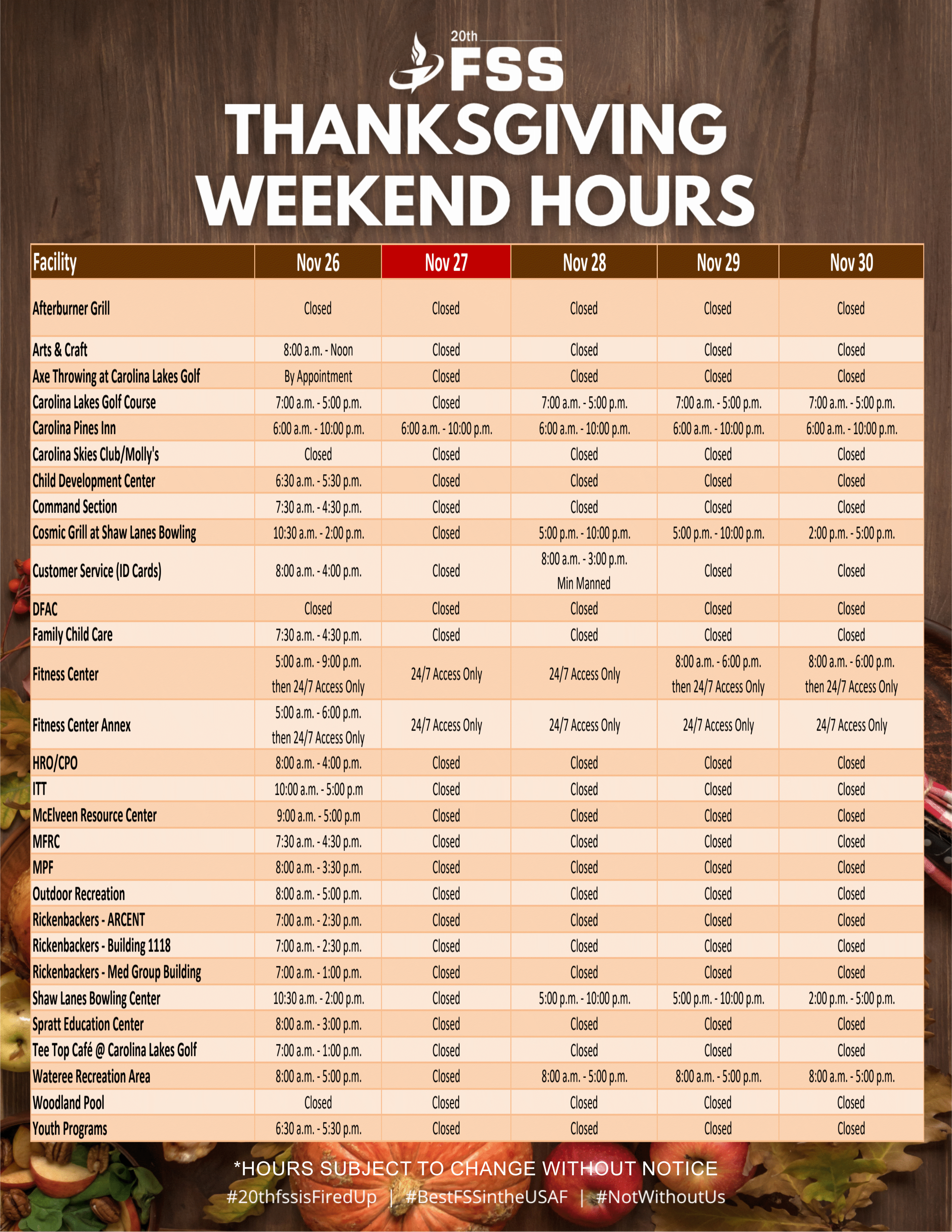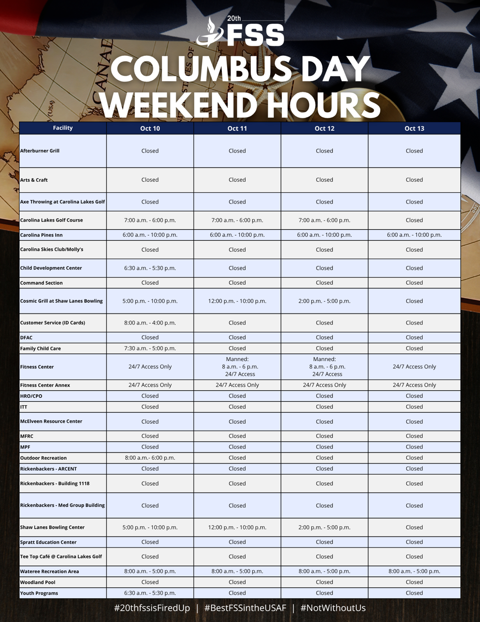Closed: New Year's Day, Thanksgiving Day Christmas Eve, and Christmas Day Woodland Pool (803) 895-3446 401 Mitchell Street 2025 Summer Open Swim: Thursday - Friday: 1 p.m. - 6 p.m. Saturday & Sunday: 11 a.m. - 6 p.m. Lap Swim: Wednesday - Friday: 11 a.m. - 1 p.m. Pool Parties (call to schedule) | Food Services Afterburner Grill Closed Until Further Notice (803) 895-4349 5802 Killian Avenue Carolina Skies Molly's Bar & Grill (803) 666-3651 487 Myers Street Lunch: Tues. - Fri.: 11 a.m. - 1:30 p.m. Office/Admin: Tues. - Thurs 8 a.m. - 4 p.m. Cosmic Grill @ Shaw Lanes (803) 895-2732 416 Recreation Street Summer Hours (April 1 - August 31) Tuesday- Thursday: 10:30 a.m. - 2 p.m. Friday: 10:30 a.m. - 9 p.m. Saturday: 5 - 9 p.m. Winter Hours (September 1 - March 31 Tuesday- Thursday: 10:30 a.m.- 7 p.m. Friday: 10:30 a.m. - 9 p.m. Saturday: 5 - 9 p.m. Emerson E. Williams Dining Facility Closed Until Further Notice (803) 895-9791 417 Polifka Drive Rickenbacker's (1118) (803) 895-2701 504 Shaw Drive Monday - Friday: 7 a.m. - 2:30 p.m. Rickenbacker's (ARCENT) (803) 885-8581 1 Gabreski Drive Monday - Friday: 7 a.m. - 2:30 p.m. Rickenbacker's (Med Clinic) (803) 895-6401 431 Meadowlark Street Monday - Friday: 7 a.m. - 1 p.m. Tee Top Cafe @ Golf Course (803) 895-1399 400 Stuart Street Monday - Friday: 7 a.m. - 1 p.m. Other Services Military & Family Readiness Center (803) 895-1253 524 Stuart Avenue Monday - Friday: 7:30 a.m. - 4:30 p.m. Airman Leadership School (803) 895-2671 398 Shaw Drive Monday - Thursday: 8 a.m. - 4 p.m.